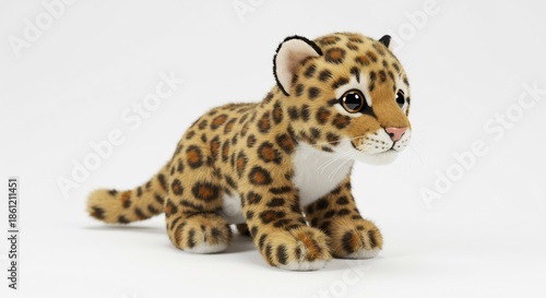 Fototapeta premium 可愛らしい子豹のぬいぐるみふんわりとした毛並みと斑点模様が魅力的明るく清潔な白背景で優しく輝くような表情. AI Generated