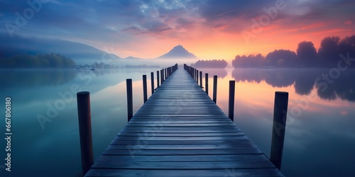 © AkimD, Fototapeta premium AI Generated. AI Generative. Dock wooden pier at sunset. Romantic relaxing vibe background. Graphic Art