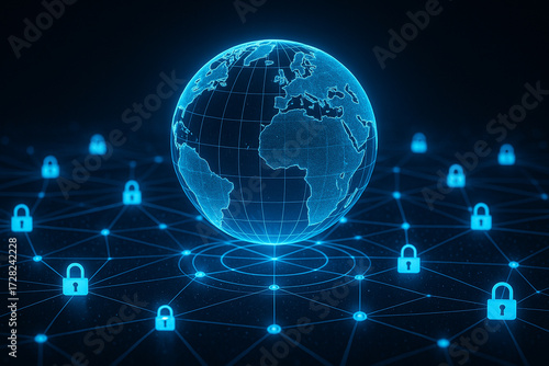 Fototapeta premium AI generated futuristic artwork showing glowing blue Earth floating above digital network with padlock nodes symbolizing cybersecurity data protection secure connection and global trust