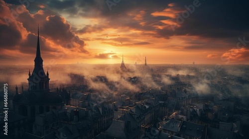 © Amrulqays/Wirestock Creators, Obraz premium AI generated illustration of a cityscape shrouded in a thick fog, creating an ethereal atmosphere