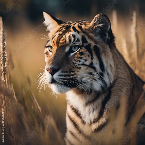 Fototapeta premium AI generated illustration of a majestic tiger standing stoically in a sea of tall green grass