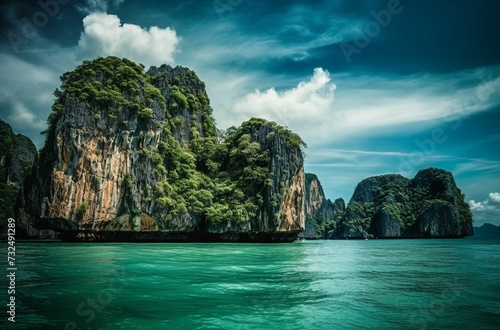 © Wirestock, Obraz premium AI generated illustration of a picturesque landscape featuring a body of water surrounded by rocks