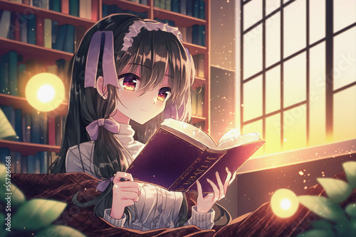 Fototapeta premium ai generated illustration of a young anime girl reading a book in a room