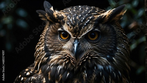 © Wirestock, Fototapeta premium AI generated illustration of Intense gaze of an owl in the dark night
