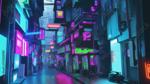 Fototapeta premium アニメ調のサイバーパンク背景イラスト(AI generated image)