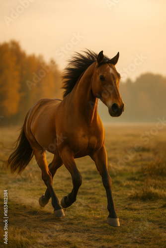 Fototapeta premium AI-generated image of a chestnut Morgan horse gallops through an autumn...