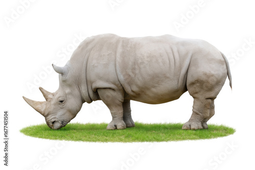 Fototapeta premium AI-generated image of a powerful white rhinoceros standing on fresh green grass against a clean white background.