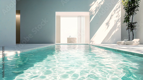 Fototapeta premium AI Generated - Indoor swimming pool in a room with blue walls and white...