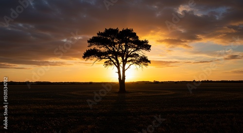 © my, Obraz premium AI Generated Landscape of Silhouetted Tree at Sunset with Radiant Sky and Negative Space