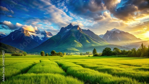 © nick, Fototapeta premium AI Generated Landscape Photography: Green Grass Field Mountain Scenery, Nature Portrait