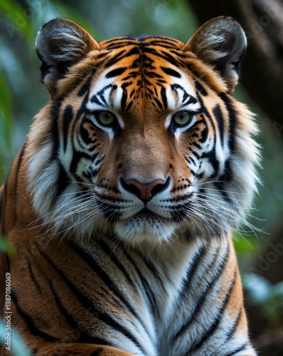 Fototapeta premium AI-generated majestic tiger in a lush forest setting, showcasing its striking...
