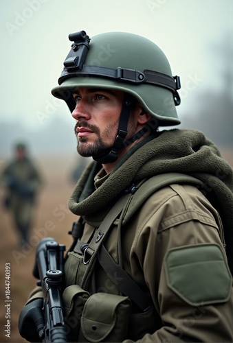 © videodoctor, Naklejka premium AI generated Military operative in tactical gear surveys environment with alertness
