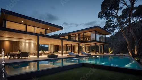 © AI-Chitect, Obraz premium AI-generated modern house blending Spanish, and Australian styles with natural materials, serene backdrops, and varied lighting conditions