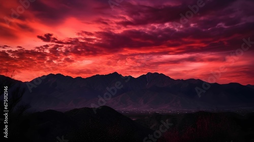 Obraz premium AI generated red sky over a majestic mountain range at dusk