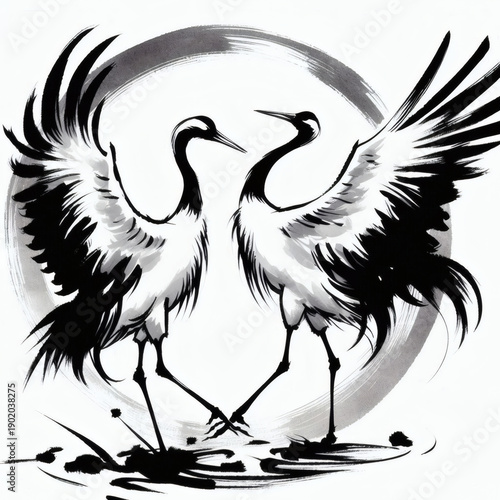 Naklejka premium 夫婦鶴と円形フレームの墨絵 飛翔と繁栄のシンボル 和柄グラフィック素材 AI-generated using DALL·E3