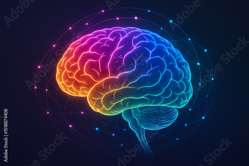 © NongEngEng, Obraz premium AI generated vibrant brain with rainbow glow and neural network structure on dark gradient background symbolizing imagination connectivity balance and futuristic intelligence