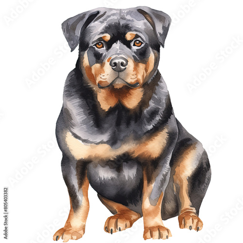 © beyouenked, Obraz premium AI-Generated Watercolor Rottweiler sitting Clip Art Illustration. Isolated elements on a white background.