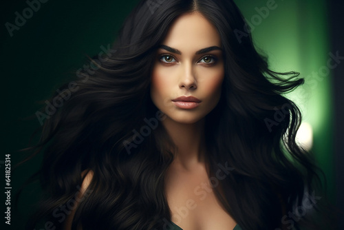 © Bogdan, Fototapeta premium ai generative, beautiful girl looks at the camera with long dark developing hair, on a dark background