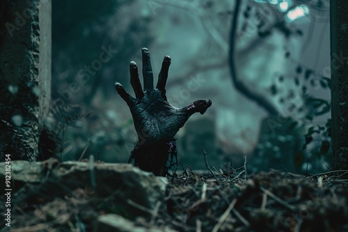 © Miftah, Obraz premium ai generative creepy hand coming out of grave