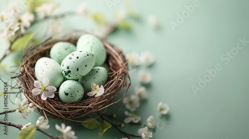 © OrangRobot, Fototapeta premium AI generative. Easter banner template with Easter eggs in the nest on light green background