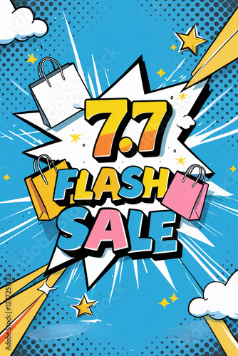 Fototapeta premium AI Generative. Poster design of 7.7 flash sale with halftone dots and blue explosion burst shape with a thick black outline. Above the bags, a white sign. 2