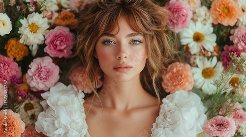 © Nan, Naklejka premium AI generator image of womans head covered with roses flowers,beautiful model wearing pink floral dress made of real flowers, her whole body is covered with delicate peonies and roses flower background
