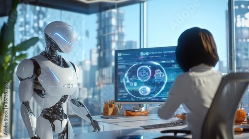 © EwaStudio, Fototapeta premium AI Helping Humans Analyze Data in a Futuristic Office.