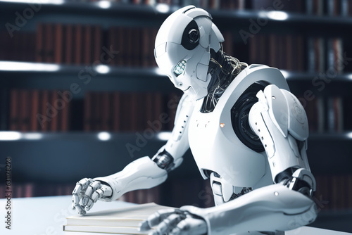 Fototapeta premium AI humannoid robot reading book in library, artificial intelligence concept....
