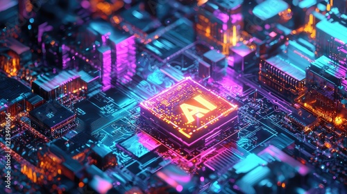 © elimicel, Obraz premium AI Microchip with Neon Circuitry Abstract