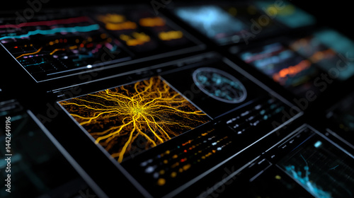 © junaid, Obraz premium AI neural network simulation on glowing screens, ultramodern interface