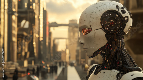 © Sahraya, Fototapeta premium AI or artificial intelligence with the computer brain as a neural network. Programming and Deep machine learning of neural network. Robot Head with cybernetically mind. Abstract Interface elements.