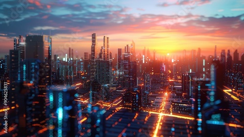 © UMAR SALAM, Fototapeta premium AI-powered cybersecurity sentries patrolling a glowing virtual cityscape at sunrise.