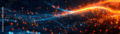 Obraz premium AI Powered Innovation Lab: Glowing Abstract Digital Art Banner Showcasing R&D Transformation with Waves, Circuits & Cost-Effective Tech Solutions