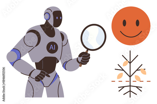 Fototapeta premium AI-powered robot examines a magnifying glass focused on progress, accompanied by a happy face and stylized tree graphic. Ideal for AI, innovation, analysis, environment, technology, growth, success