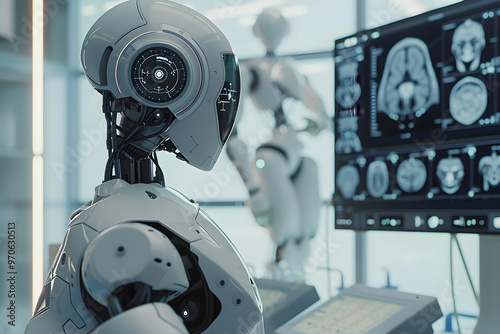© Ram, Fototapeta premium AI robot analyzing human brain scans in a futuristic laboratory setting, illustrating cutting-edge technology, artificial intelligence in medical diagnostics, and innovation in healthcare