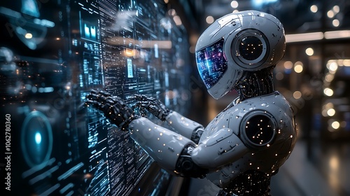 Fototapeta premium AI robot analyzing multiple holographic data displays, arms extended with...