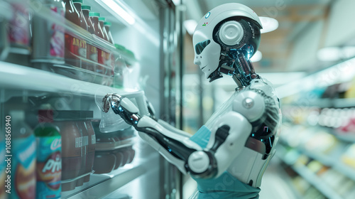 Fototapeta premium AI Robot as Housemaid Organizing Refrigerator Shelves in Kitchen – Advanced Home Assistance and Smart Cleaning Technology