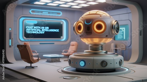 Fototapeta premium AI robot in futuristic office; chat interface; meeting room background; tech...