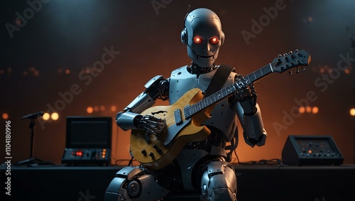 Fototapeta premium AI robot musician playing guitar on stage.