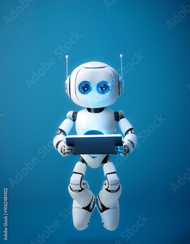 © Saddha Visual, Fototapeta premium AI Robot using tablet floating or flying isolated on light blue background