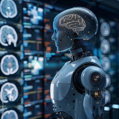 © Mohil, Fototapeta premium AI Robot with Digital Brain, Futuristic Artificial Intelligence Analyzing Data in a High-Tech Laboratory