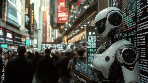 Fototapeta premium AI robot working alongside human traders in a bustling futuristic stock exchange.