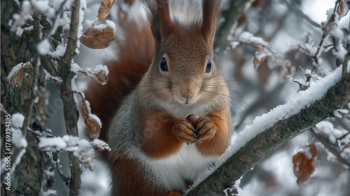 Fototapeta premium Ai squirrel holding a nut in snowy forest during winter season, sitting on a...