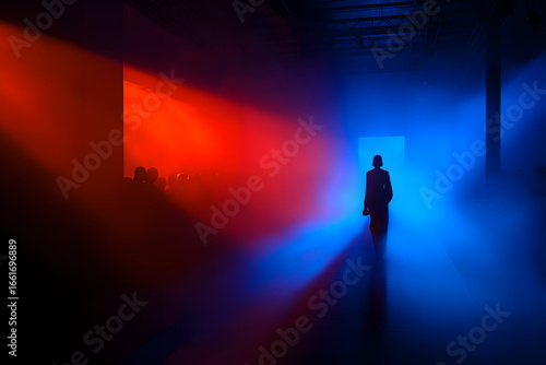 Fototapeta premium AI surreal neon landscape: Lone figure is consumed by surreal space, bathed in dramatic light creating an ethereal and slightly unsettling atmosphere
