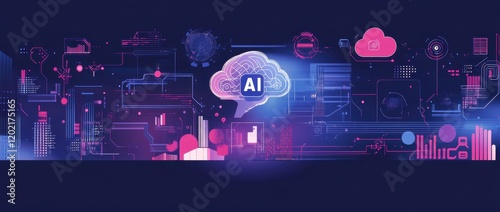 © SKIMP Art, Obraz premium AI technology background with text "AI" and digital elements on a dark blue color, web banner design vector illustration, concept art of artificial intelligence technology Generative AI