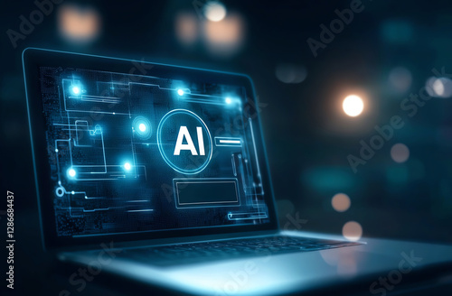 © Tondone, Obraz premium AI technology displayed on laptop screen with glowing circuits and modern design, showcasing innovation and digital advancement