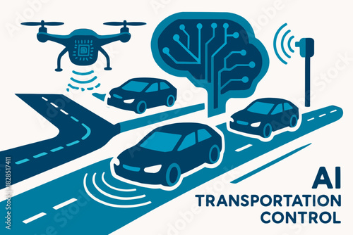 Naklejka premium AI Transportation Control System with Autonomous Vehicles and Drone.