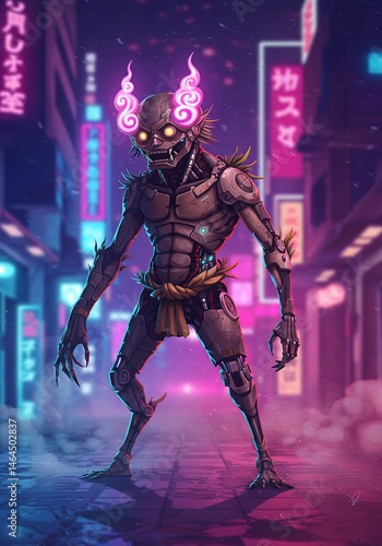 © Akatsuki Vision, Naklejka premium AI, yokai, vector, lineup, characters, cyber, enhanced, tech, mythical, digital, forest, background, dark, futuristic, creature, group, character design, illustration, robotic, eyes, neon, spirit, tra