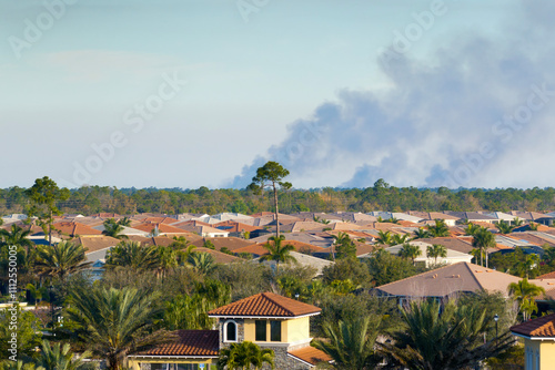 © bilanol, Obraz premium Air contamination with burning smoke from prescribed fire close to suburban area in Florida, USA