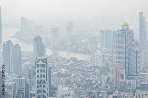 © Chinnapong, Obraz premium Air pollution in Bangkok with PM2.5 air-quality index (AQI) reached dangerous level with dust and smog in hazy sky, threatening to public health, rooftop view